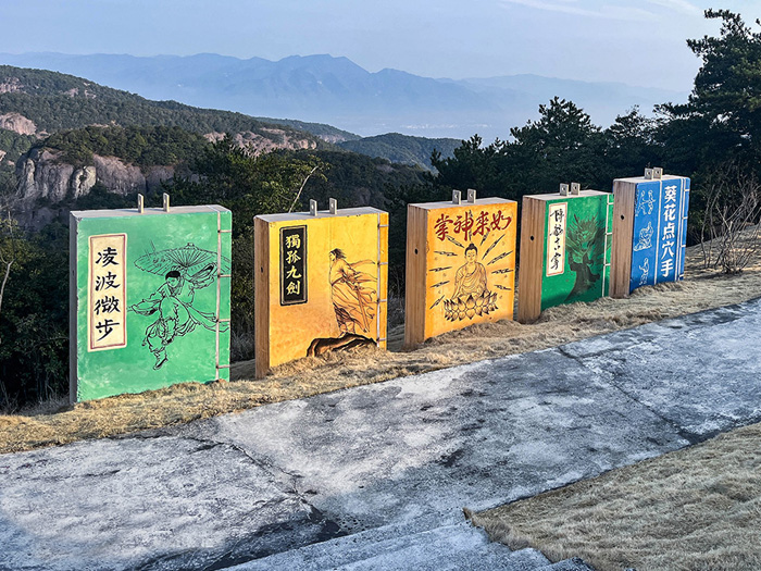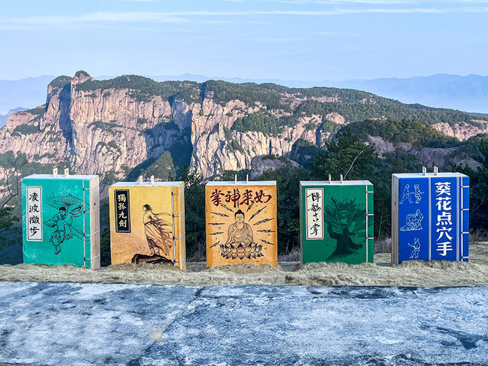 景区里的水泥墩本身是建设时期用到的,但是游客看到就会觉得很奇怪。那就改造一下吧!这种扁平的造型,一般是现有根据造型去思考,比如一本书,扑克牌,麻将,一个盒子,一个画框,等等。从互动性的角度,最后做成一套武侠书,在这南天顶山巅之处,游客们辛苦爬上来,居然能看到有这一套武林绝学,也会勾起曾经看金庸武侠片时的记忆。
